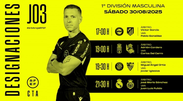 8月30日讯 西甲官方公布了当地时间周六进行的4场西甲比赛的裁判安排,其中何塞-马里亚-桑切斯将执法皇马VS马洛卡。